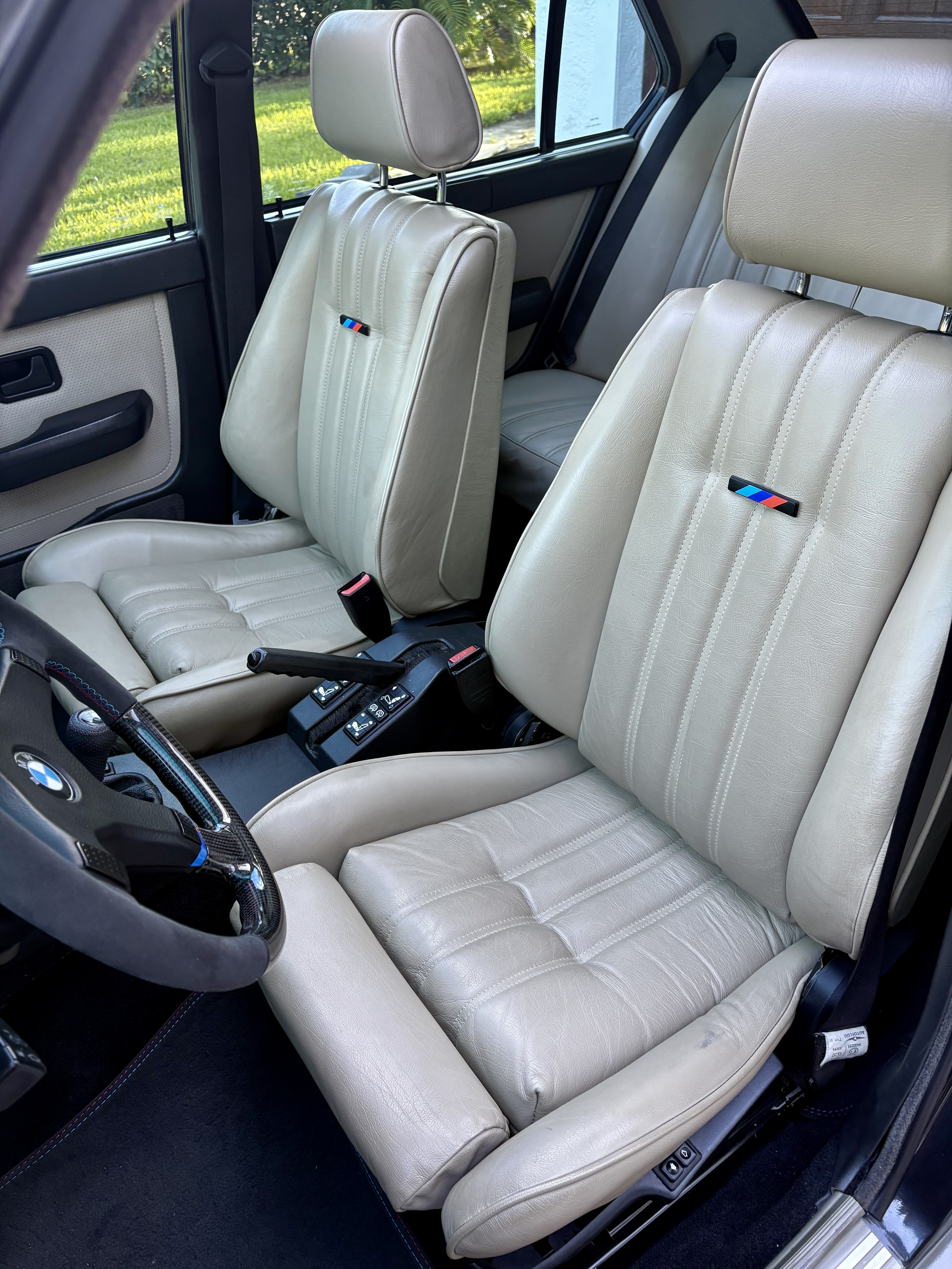 On the interior new sound deadening butyl mat was installed before laying in new carpet, new headliner, new rear deck liner, leather wrapped dashboard as well as fully functional front BMW seats with from an M5 with new leather. The M5 seatback badging is authentic. Leather M shift installed and beautifully refinished wood and suede M-Tech M5 steering wheel. The suede grips at the 3 and 9 position are truly wonderful for long distance driving.